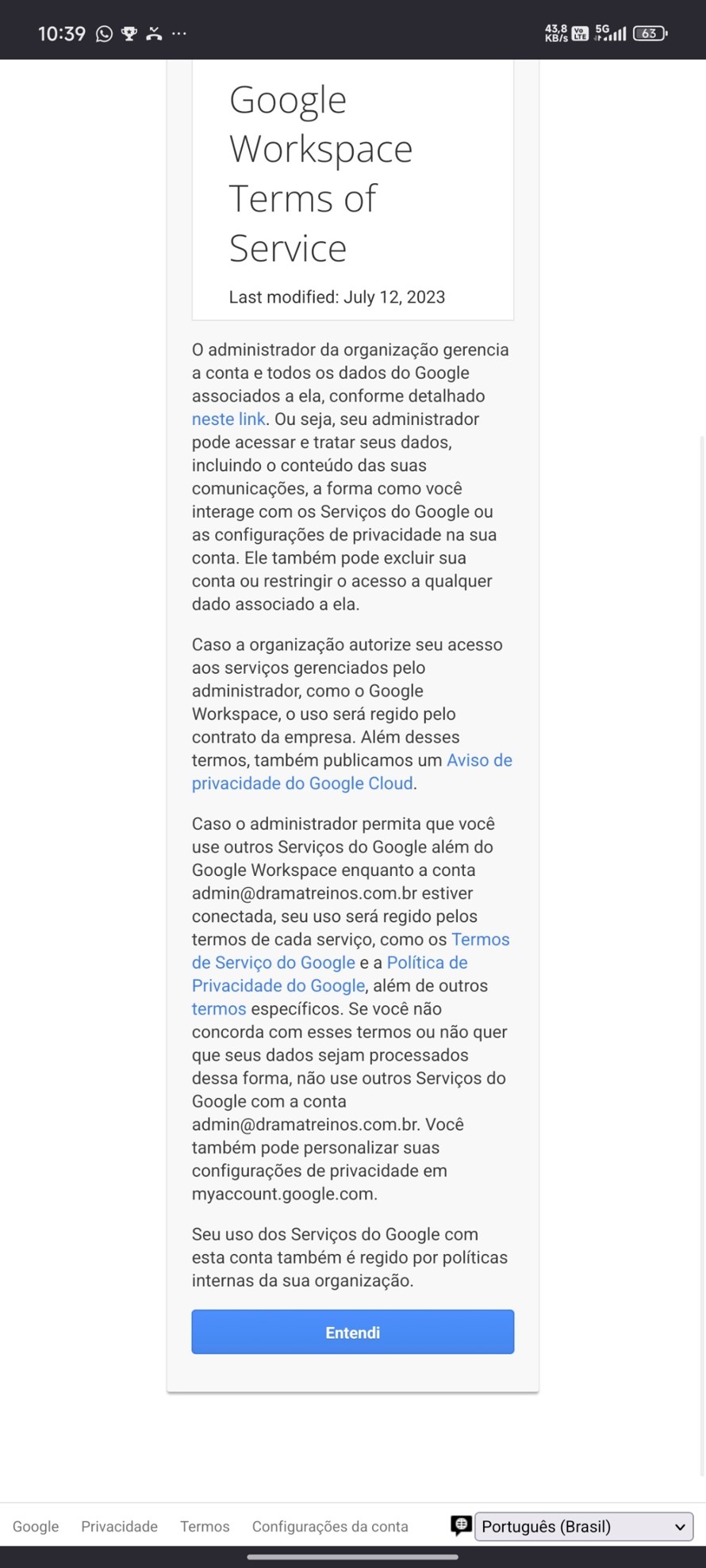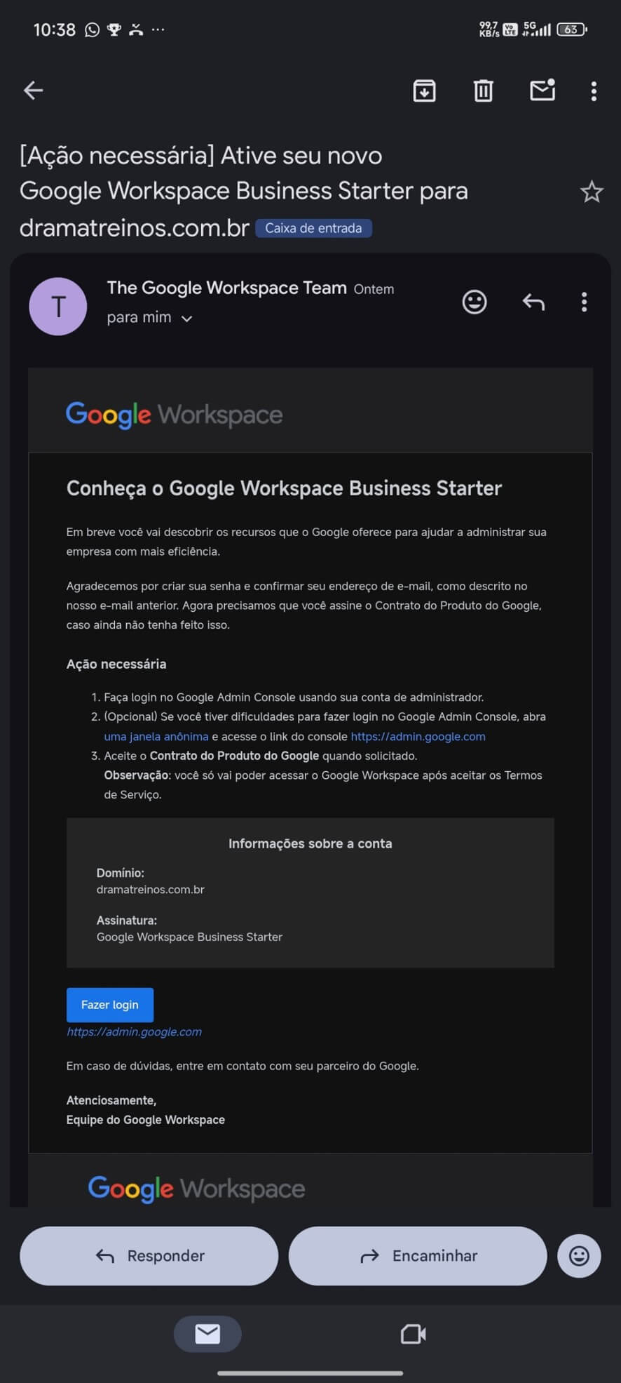 Será enviado automaticamente dois e-mails do Google após a ativação do serviço (em até 5 dias depois da confirmação da compra). O primeiro e-mail terá os Termos de Uso.
