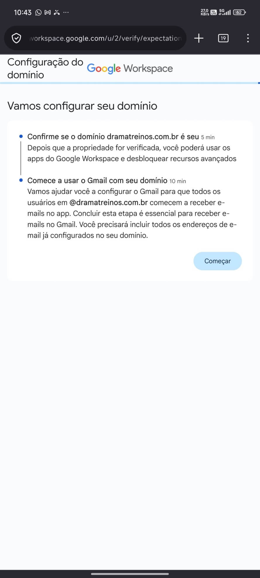 Iremos começar com a configuração do seu domínio. Clique em Começar.