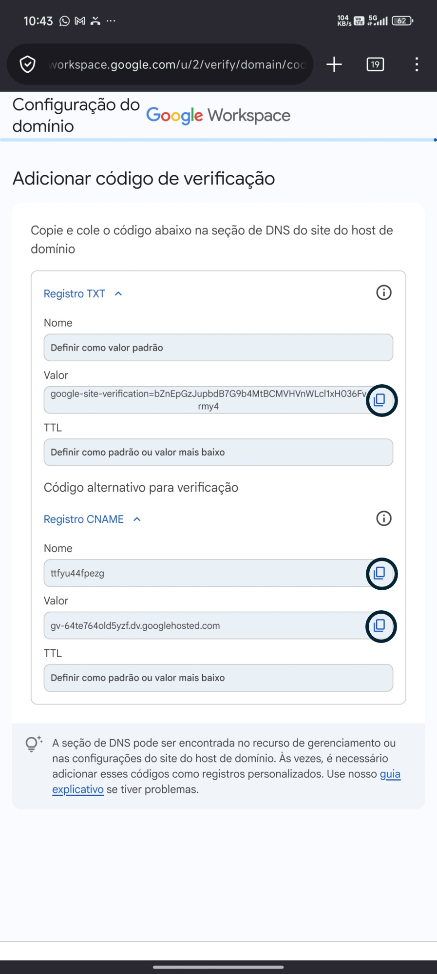 Precisaremos alterar as portas TXT e CNAME do seu domínio. Realize a cópia dos valores nos links disponíveis na lateral direita.