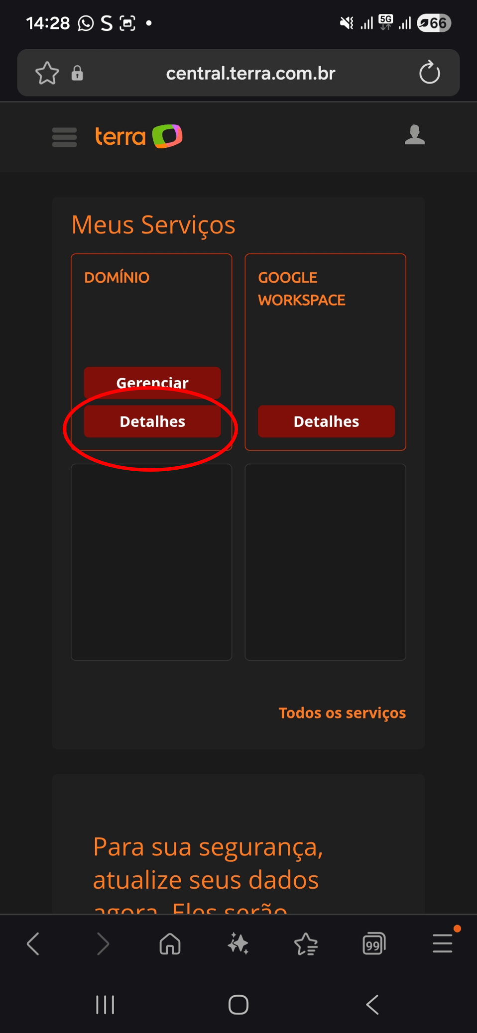 Para usar o serviço, você deverá transferir o seu domínio para o Terra. Solicite o seu tranfer token no seu provedor atual de serviço, e ligue para a nossa Central de Relacionamento para finalizar a transferência: 0800 777 9797. Após a transferência concluída, será necessário alterar as portas acesse a Central do Assinante: https://central.terra.com.br/login. No card do serviço Domínio clique em Detalhes.