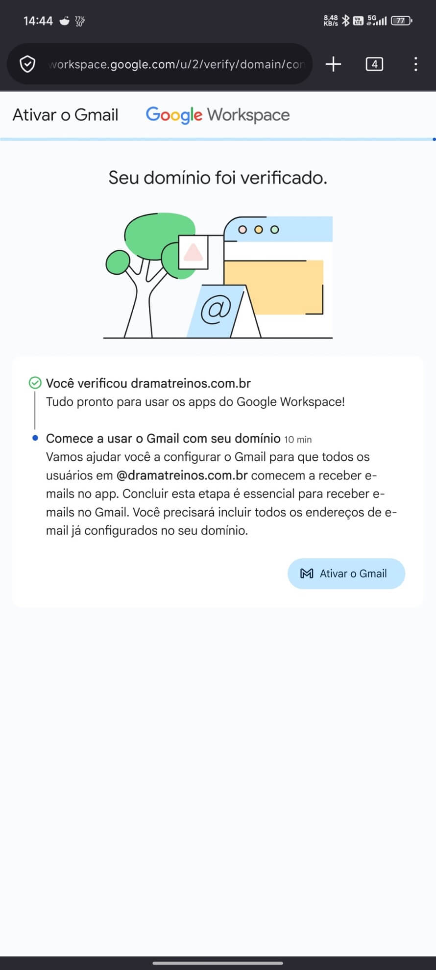 Você receberá a mensagem você verificou o seu domínio. Agora você está pronto para ativar os seus serviços Google! Com essas configurações realizadas você irá receber um e-mail do nosso parceiro Ipnet para ajudar com a usabilidade da plataforma e aplicativos do Google Workspace. Explore todas as funcionalidades para obter os melhores recursos para a sua empresa. Siga as instruções que serão enviadas no seu e-mail.