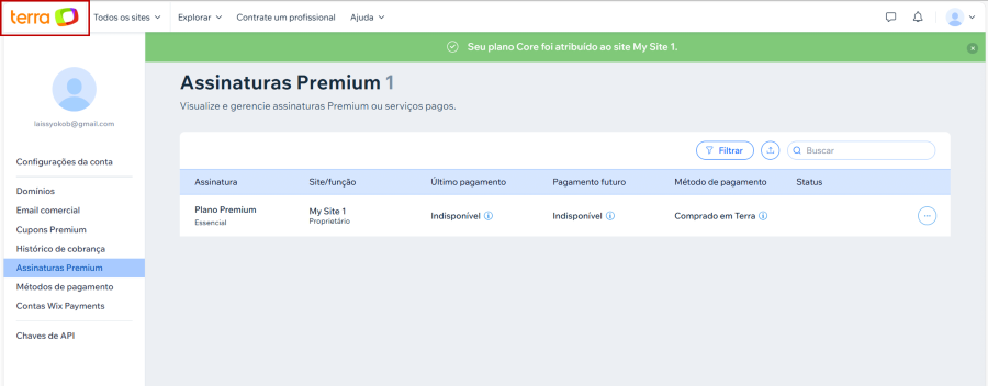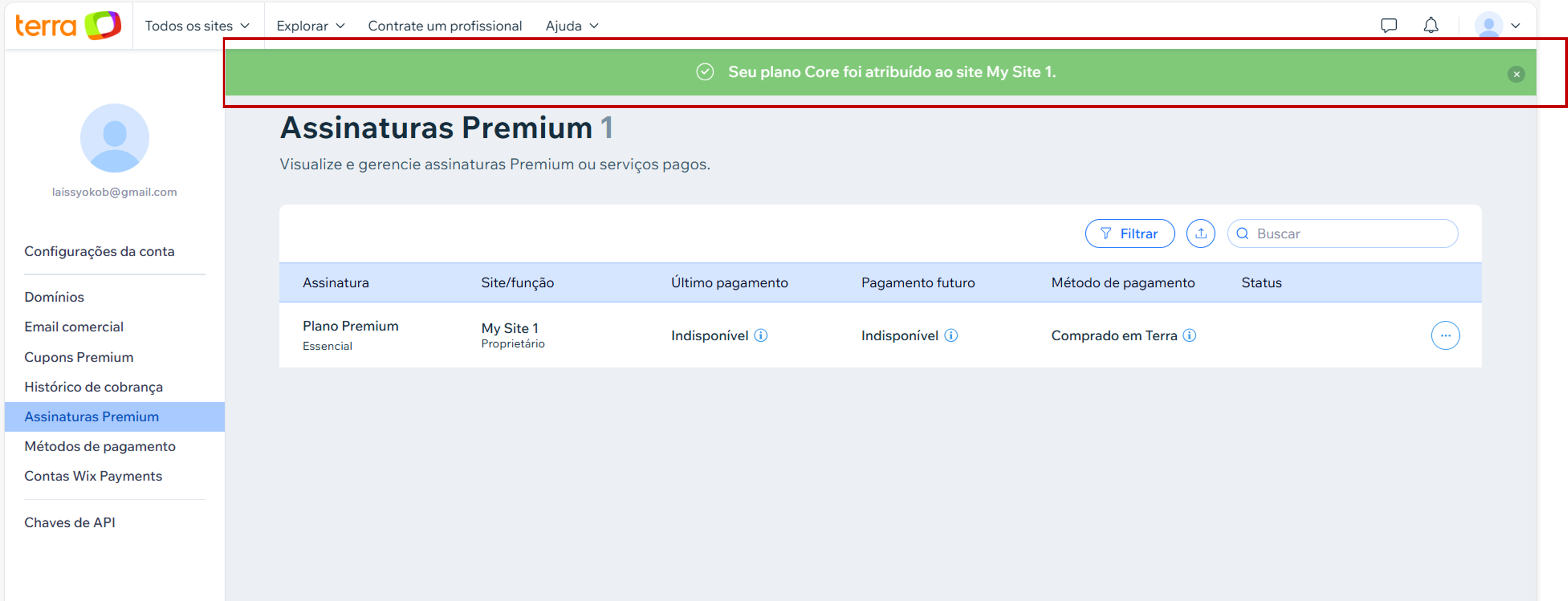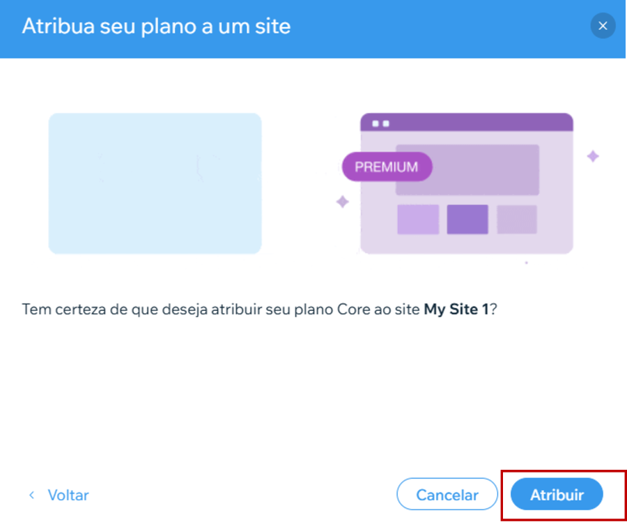 - 8) E pronto! Você visualizará a mensagem “Seu plano Core foi atribuído ao site [Nome da Sua Loja]”